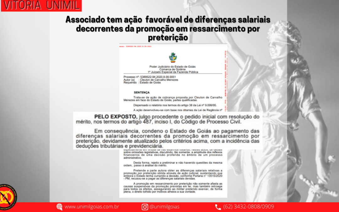 O associado Cleuton de Carvalho Menezes nos procurou para que suas diferenças salarias fossem regularizadas. Sendo assim, com o andamento do processo, a sua ação foi favorável, tendo suas diferenças salariais decorrentes da promoção em ressarcimento por preterição garantidas.