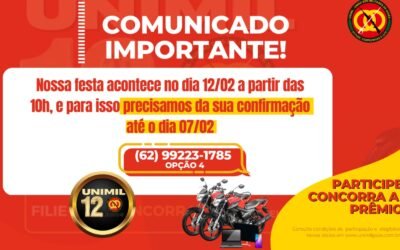 UNIMIL 12 ANOS: 12 PRESENTES PARA VOCÊ! Nossa associação completa 12 anos e nós queremos presentear você associado! No dia 12/02/2023 faremos uma SUPER FESTA onde sortearemos DUAS MOTOS YBR 150 FACTOR além de mais 10 outros prêmios entre notebooks, celulares, TVs e...